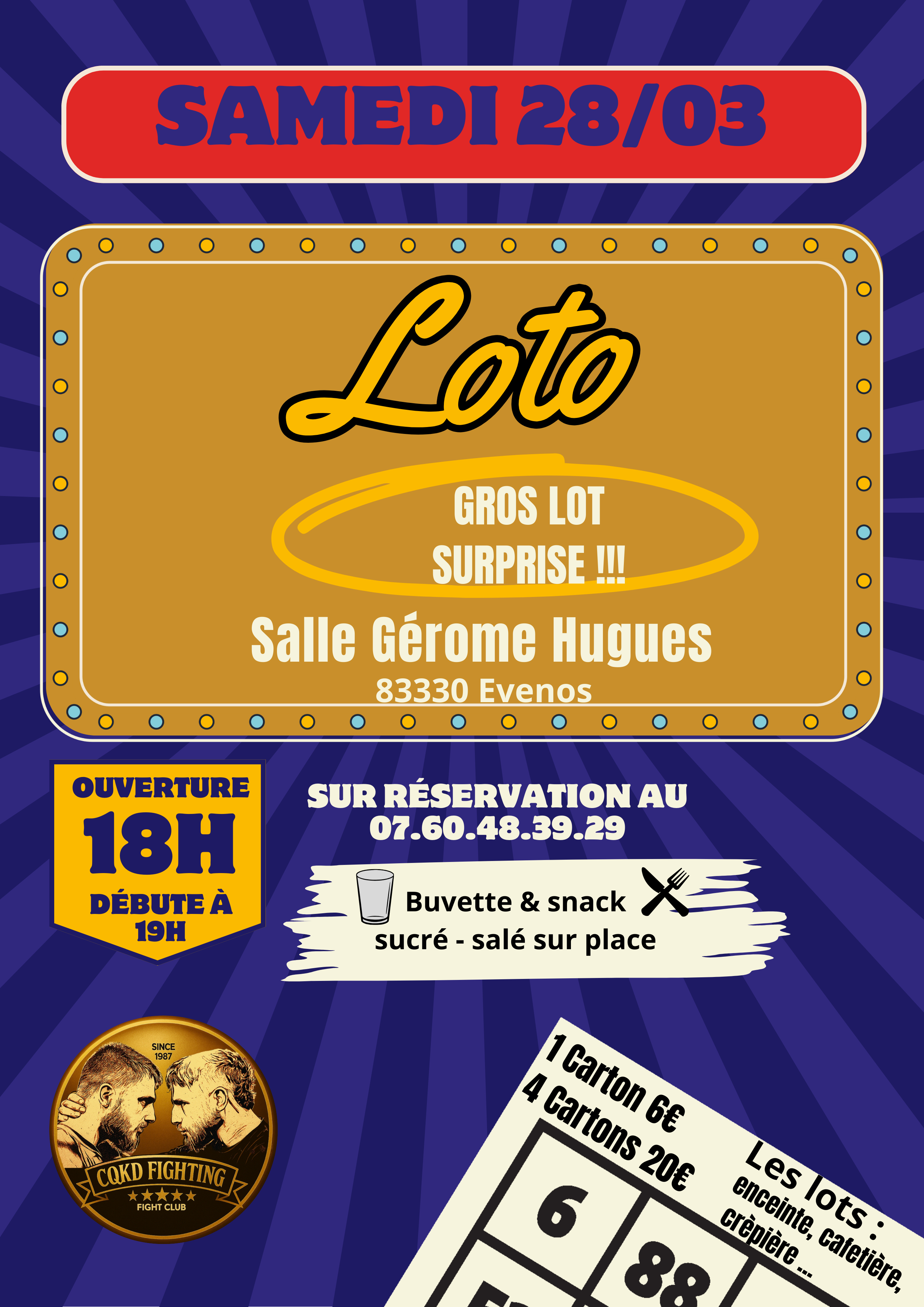 L’association CQKD Fighting d’Evenos vous convie à son loto le samedi 28 mars à 18h salle Gérôme Hugues à Sainte Anne d’Evenos.