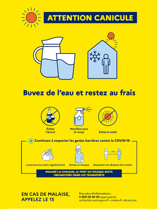 Vous trouverez ci-après les comportements à adopter en cas de fortes chaleurs (cliquez sur l’affiche pour ouvrir le dépliant du Ministère des Affaires Sociales et de la Santé).