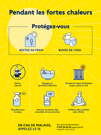 Ces recommandations sont issues d’un dossier du Ministère de la Santé et des Affaires sociales consultable ici : https://solidarites-sante.gouv.fr/sante-et-environnement/risques-climatiques/article/les-recommandations-pour-les-populations-en-cas-de-chaleur