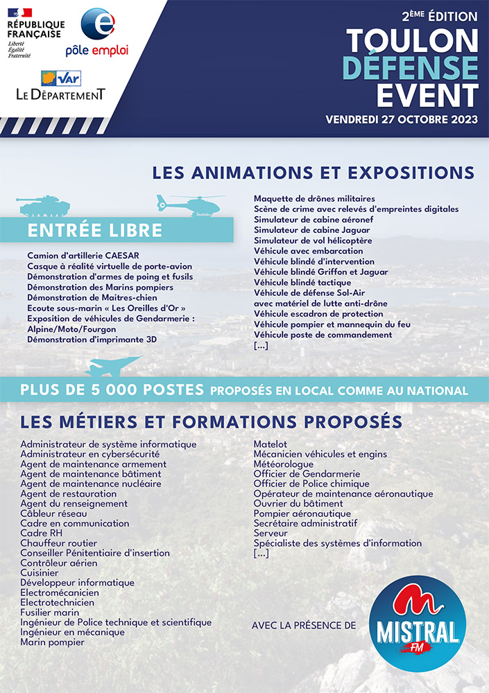 170 intervenants et professionnels de la Défense et de la Sécurité publique seront présents sur une surface d’exposition de 3000 m2 pour vous présenter les filières qui recrutent : plus de 5 000 offres d’emploi sont disponibles en région et partout en France !