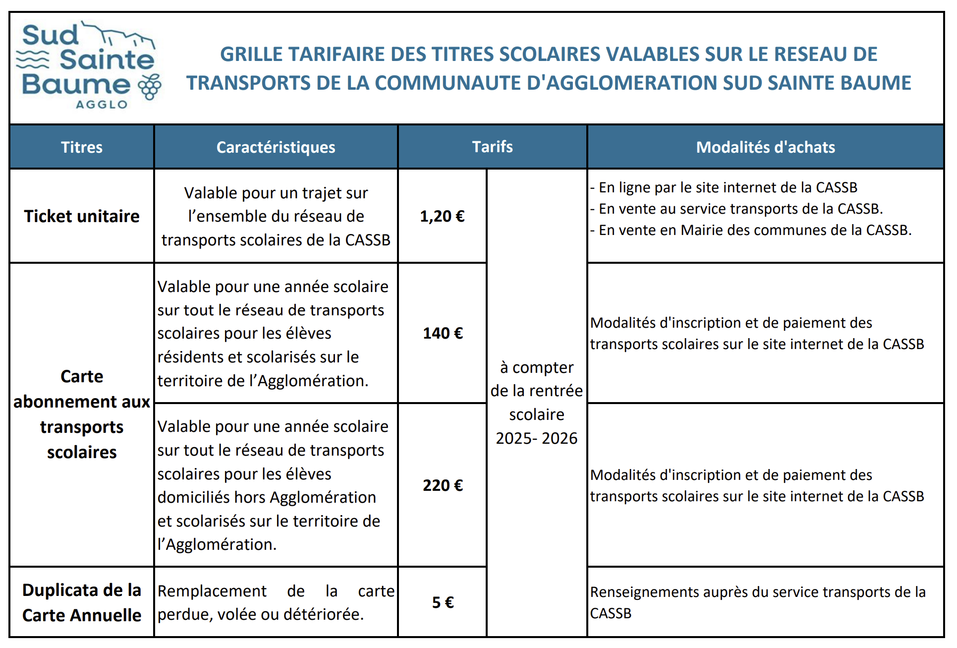 Pour une réinscription aux transports scolaires de l’agglomération Sud Sainte Baume, connexion à l’espace web du site d’inscription https://cassb.monbus.mobi/ dès le 23/06/2025 afin de procéder au paiement de l’abonnement ou de tickets unitaires.