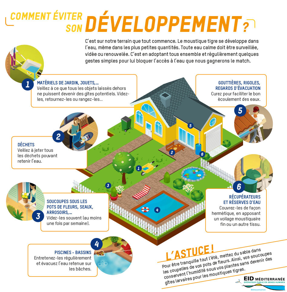 Ces « gîtes » de reproduction sont, en grande partie, « fabriqués » par l’Homme. Ils se trouvent, pour 80 % d’entre eux, au sein des domiciles privés : cours, jardins, terrasses, balcons… Il est impossible de les recenser tous et de les traiter systématiquement à l’état larvaire, car ils pullulent et sont aléatoires dans l’espace et dans le temps.