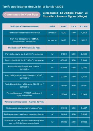Ce tableau représente la baisse des tarifs (en euros) pour l’année 2025 sur la consommation d’eau potable suivant 4 profils de foyer (hors taxe de l’agence de l’eau et hors part assainissement) :