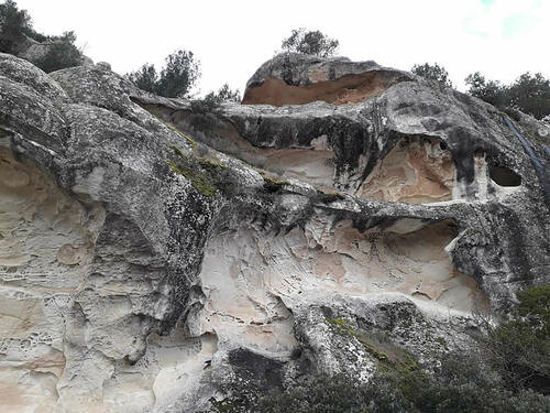 Au sortir des Gorges d’Ollioules, à gauche, sous le Gros Cerveau, on découvre les Grès de Sainte Anne formés de mamelons calcaires et de cavités sculptées par le temps.